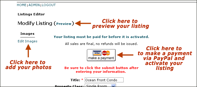 When you are satisfied with your listing press the "make a payment" button to pay for listing via paypal and activate your listing.
